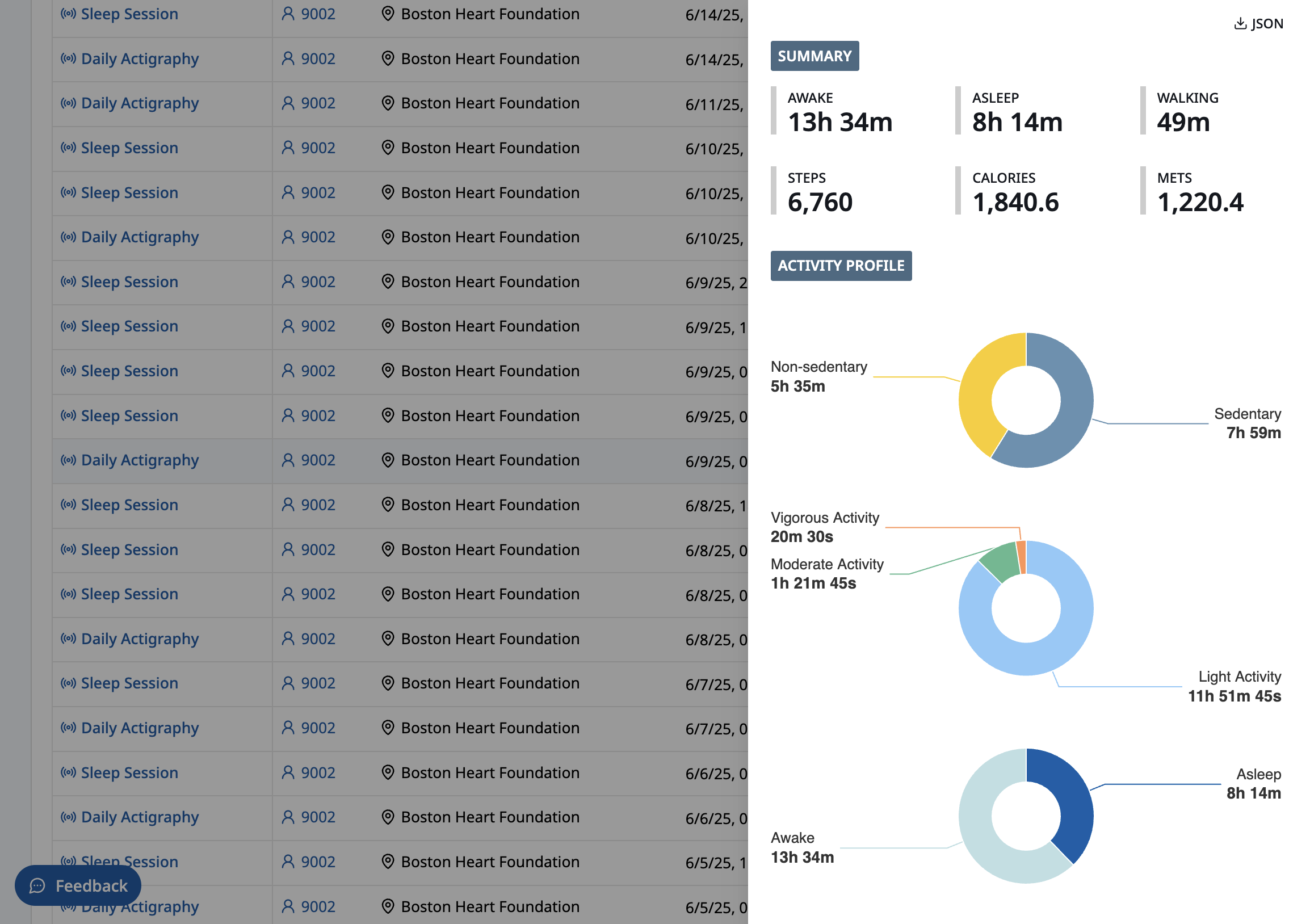An actigraphy session displayed a breakdown of a patient's activity levels and energy expenditure over a 24-hour period: