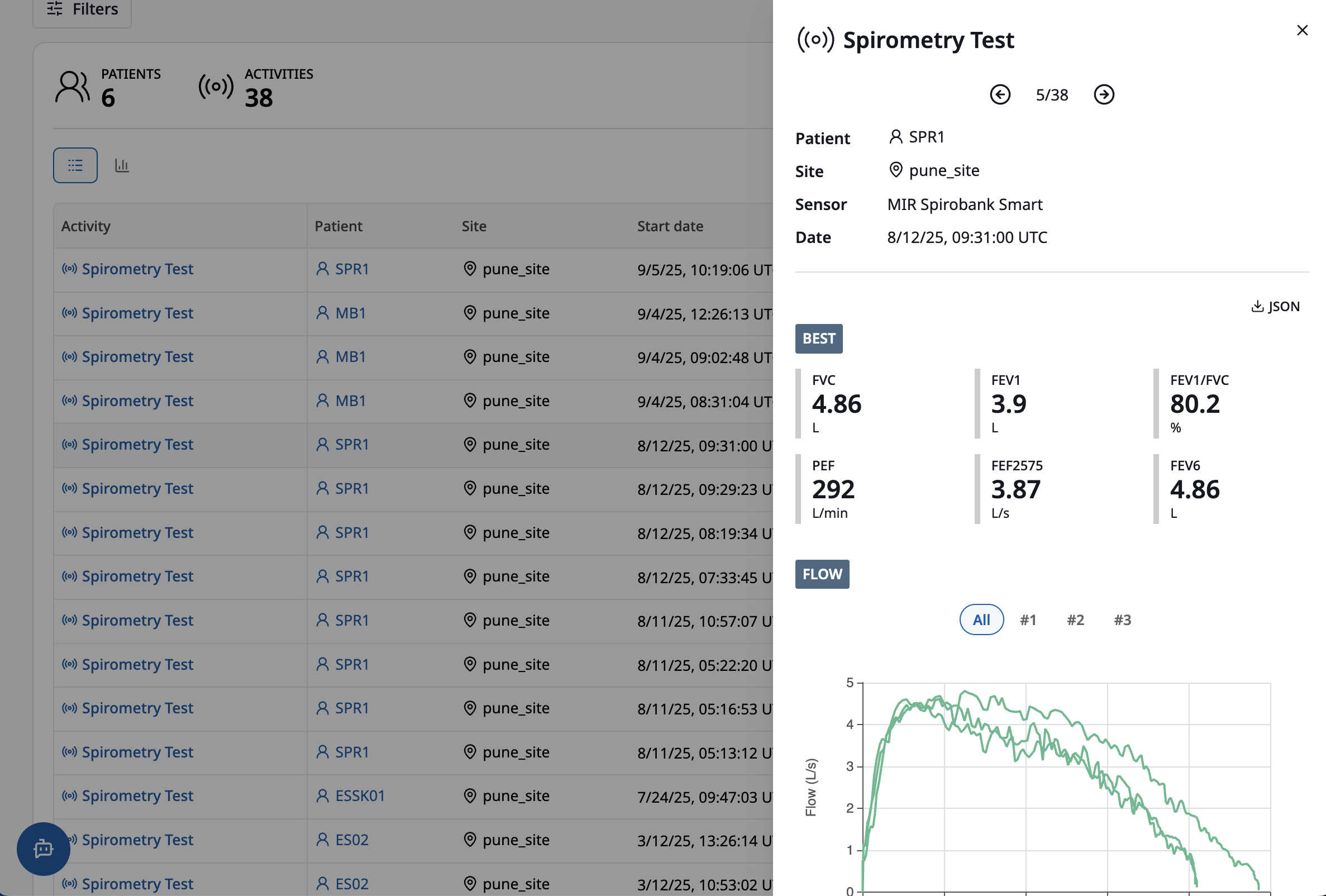 Actual sensor data, and the accompanying data visualizations, varied from one type of activity to the next. For example, a spirometry test, typically conducted over the course of several minutes, included air flow curves and related statistics: